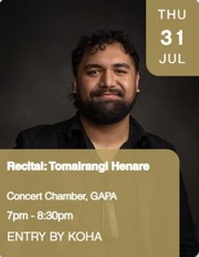 Tomairangi Henare sings as the baritone soloist in the première performance of Dame Gillian Whitehead’s The Journey of Mataatua Whare. Saturday June 28, 7:30pm, Dunedin Town Hall. Tickets and information here.